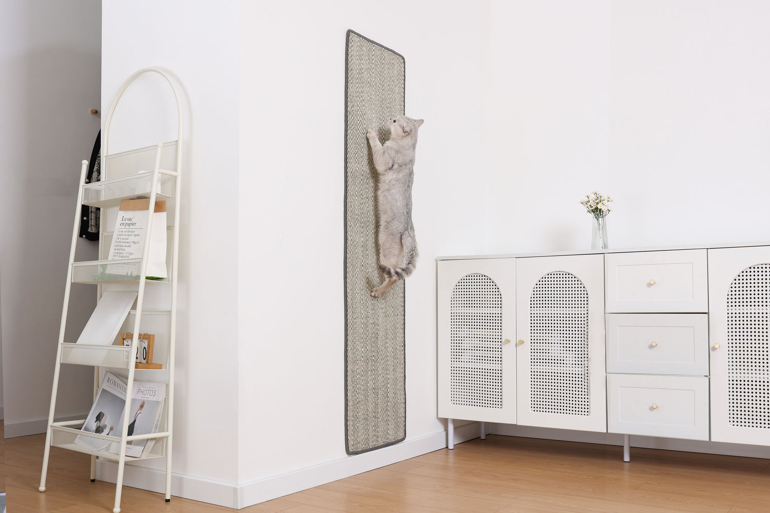Cat stretching on a vertical Boho-style scratchable runner in a modern living room setting.