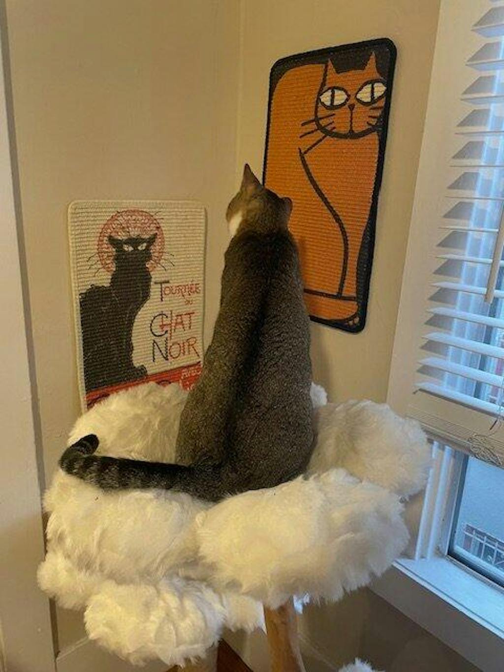 To install the scratching mat on the wall at your cat's perfect stretching height, you may use the free Velcro pads. However, if your cat scratches very hard, screws will be the best solution so you don't have to worry about it falling off anymore.