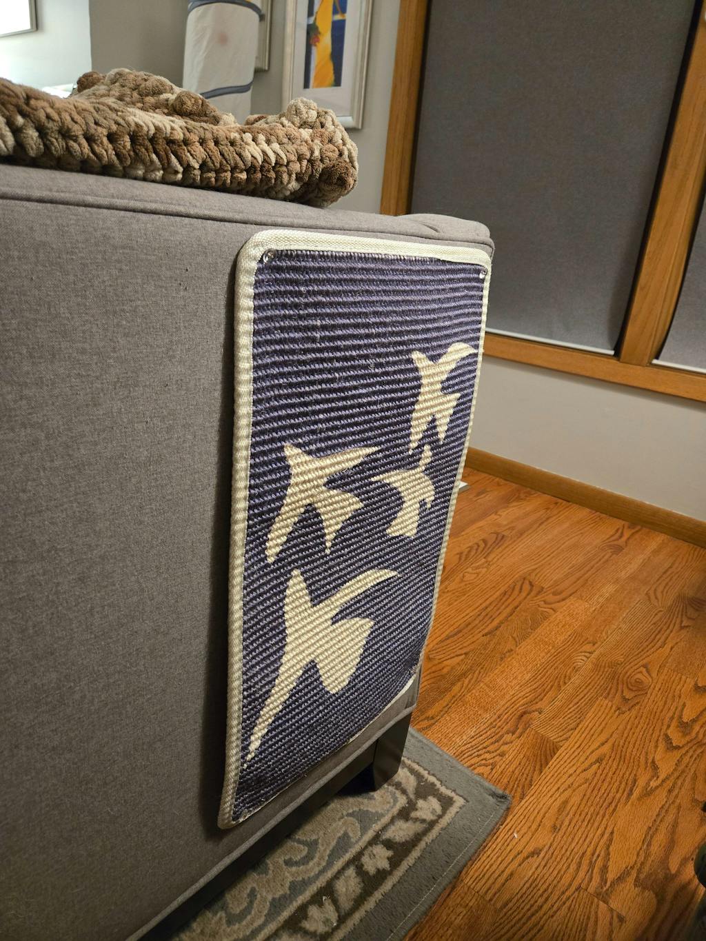 You may lay the mat flat on the sofa or stick it to its side using the free Velcro pads. If your sofa fabric allows, using twisting pins might be the best solution to prevent the mat from falling.